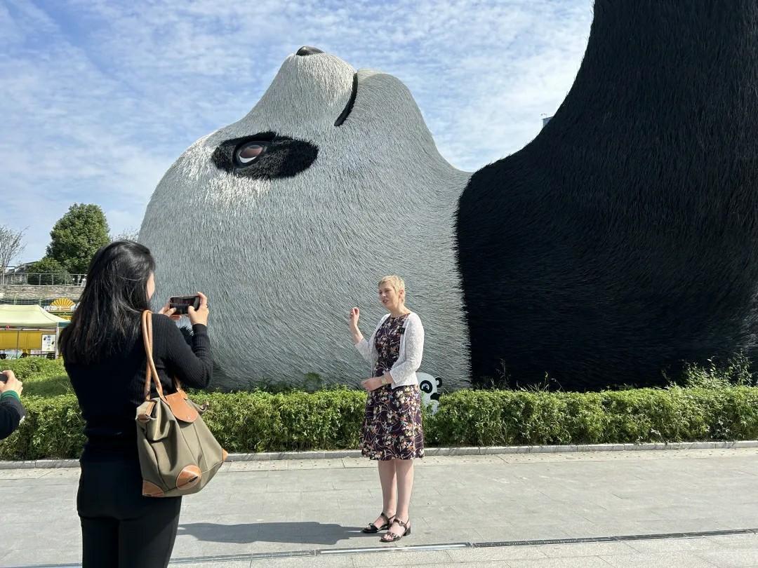 在仰天窩廣場中央,“自拍大熊貓”引人注目,這只仰臥自拍的“大熊貓”作為都江堰城市潮玩新地標,由澳大利亞昆士蘭設計公司UAP與荷蘭藝術家佛洛倫泰因·霍夫曼為都江堰市精心打造。邵美珍一行了解了這一藝術作品的創作背景和設計理念,建成后對周邊商業氛圍提升、旅游業帶動作用以及在市民文化生活中所產生的積極影響等。認為這不僅為都江堰市增添了獨特的魅力,也成為了澳大利亞與都江堰市文化交流與合作的生動見證。
