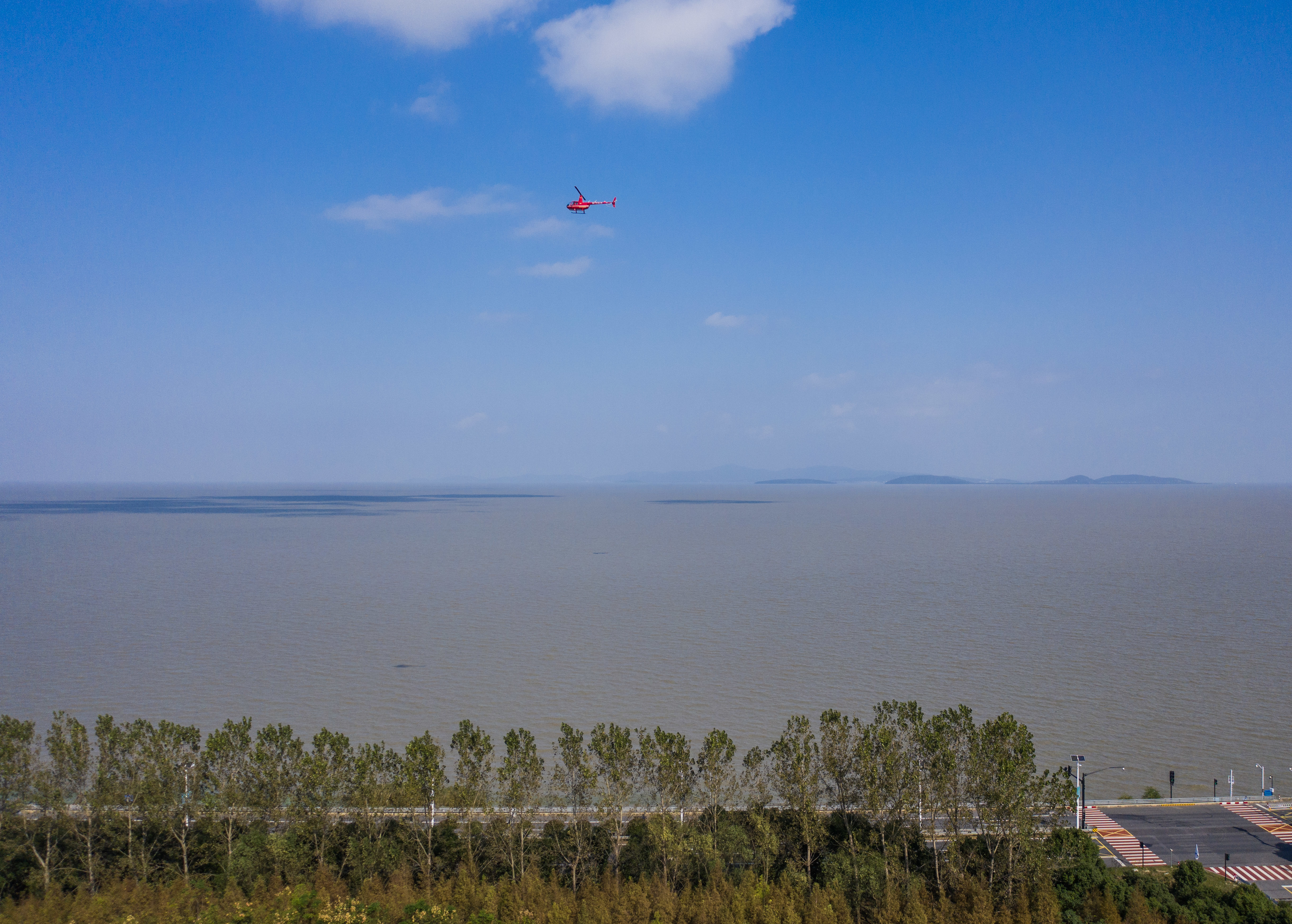 11月5日,游客乘坐米旗通航直升機飛行基地的直升機在空中飽覽太湖南岸美景。新華社記者 徐昱 攝