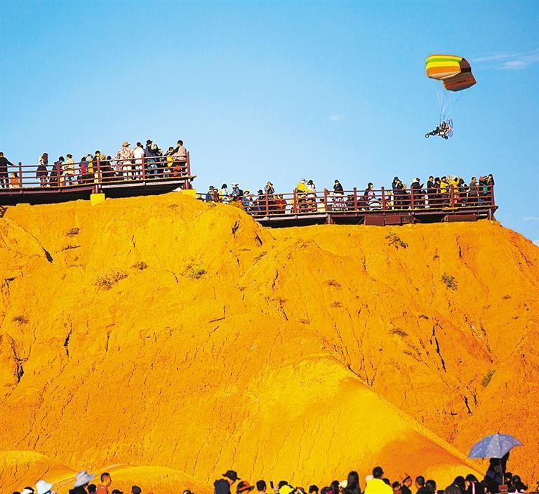 10月3日,游客乘坐動力滑翔傘游覽甘肅省張掖市七彩丹霞景區。 楊 瀟攝(中經視覺)