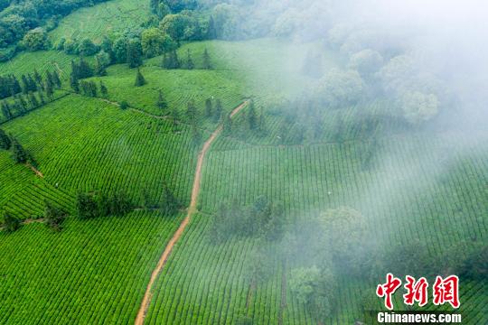 航拍江西省九江市廬山茶科所茶場的1000多畝茶園,云霧繚繞。(中新網(wǎng) 資料圖)傅建斌 攝