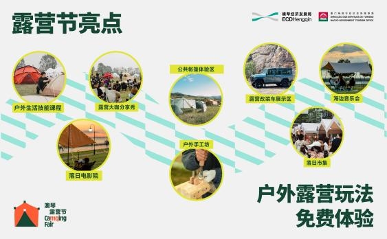 活動期間,多個功能區域將精彩亮相,包括專業露營裝備展示區、露營改裝車展示區、玩家創意區、露營展商洽談區、政府展示區&VIP休息區、公共帳篷體驗區,另外還有近30家知名品牌加盟,包括澳門通集團旗下mPass、DJI大疆、駱駝、蔚來、潤本、羅馬仕、探險者、電小二、CAMPsomeWHERE、ampm全日營等,為商家和露營愛好者搭建交流平臺。