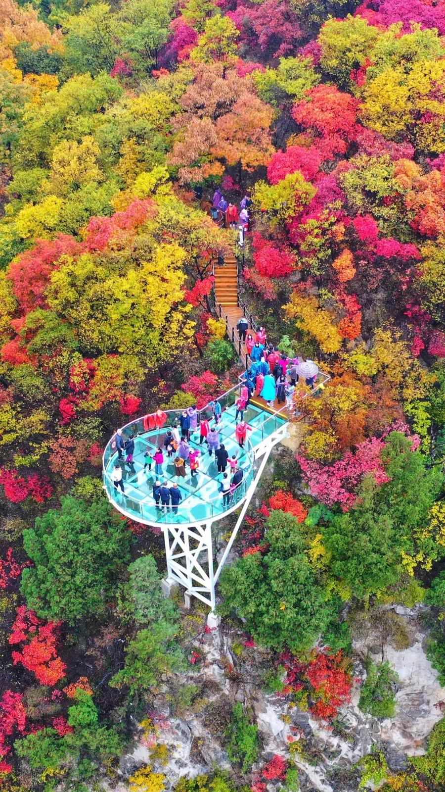 在淄博,位于泰沂山脈交匯之地的潭溪山也悄然變色。潭溪山營銷總監崔新程告訴記者,景區以黃櫨、丹楓為主的樹種形成波瀾壯闊的紅葉浪潮,很多“峰回路轉”的小路成為潭溪山賞秋的絕佳視角。景區提出“紅葉+”概念,實現了紅葉與景區其他業態的有效結合,形成了“玻璃橋上賞紅葉”“峽谷漂流賞紅葉”“野奢旅居賞紅葉”“深谷懸崖賞紅葉”等多種賞紅葉方式。“這種融合不僅為游客提供了賞秋新概念、提升賞秋體驗感的同時,更是在一定程度上推動文旅消費。”崔新程說。