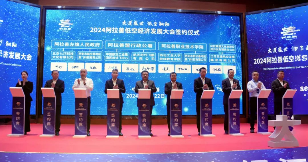 開幕式上,盟行署、阿左旗政府、阿拉善職業技術學院、盟文化旅游投資開發有限責任公司分別與航天時代飛鵬有限公司、中國航空工業集團民機試飛中心、西安市航空基地航集飛科技有限公司、北京七巧科技文化有限公司、西北工業大學繼續教育學院、江蘇亞捷航空發展集團有限公司簽訂《合作框架協議》,合作內容包括:開展低空飛行相關作業、無人機驗證飛行、銷售和服務、低空物流、飛機增雨、飛行培訓、短途運輸、應急救援、物流快遞、農業植保、文旅觀光等諸多方面。