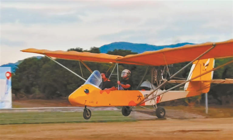 其間,記者走進該基地的航空飛行營地,遠遠看到一架輕型運動飛機載著游客,從營地的跑道滑行,然后掠過草坪,騰空而起。飛機環繞著厚街橫崗湖上空飛行,帶領游客觀湖景、看云霞……