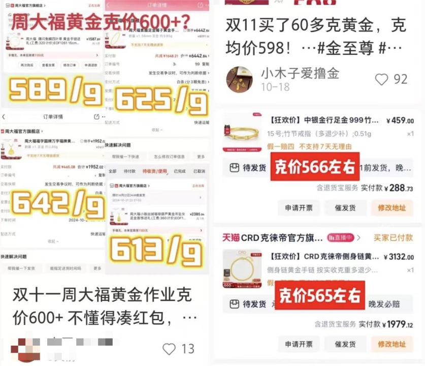 雙11的黃金券,給了慧慧入場的理由。她將手機計算器幾乎撥拉出了火花,計算著疊加黃金券后,每一件首飾最后的平均克價,從566到584元不等,但最終價格都要遠遠低于現在620元的國內金價,黃金這么保值,買到就是賺到。