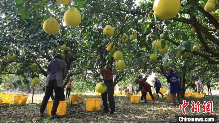 在云霧山香柚產業園,村民們穿梭柚林中采果、挑果、裝筐、搬運,現場一片繁忙。