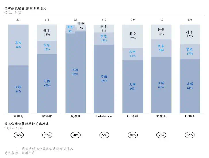 久謙中臺(tái)電商數(shù)據(jù)庫追蹤,在國(guó)內(nèi),2024年二季度威爾勝Wilson線上市場(chǎng)份額高達(dá)51%,其中天貓渠道占比高達(dá)90%。