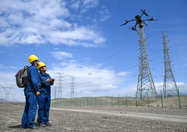 4月25日,在新疆烏魯木齊市達坂城區,國網烏魯木齊供電公司輸電運檢中心的無人機飛手哈依那爾·木那特(右)與同事使用無人機巡視220千伏達清泉輸電線。新華社記者 陳朔 攝