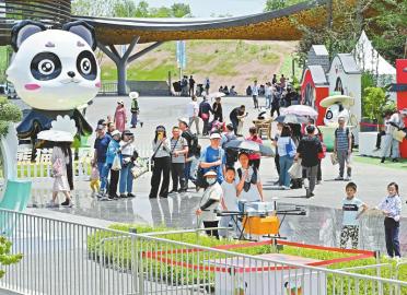 5月4日,在2024成都世園會主會場蓉城時光街旁的無人送餐點,無人機按照設定的航線將游客的外賣送達。