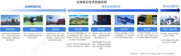 根據前瞻產業研究院發布的《2024年中國低空經濟報告》從全球低空經濟發展觀察,至今先后經歷了早期應用探索階段和規范化發展階段。其中在早期,由于低空技術不成熟,因此以低空旅游和在農業、工業的探索應用為主。2010年以后,隨著低空飛行技術的愈發成熟和應用的多元化,規范化監管成為這一時期各國低空經濟發展的主要任務。當下全球低空經濟正處于進一步的應用普及階段。