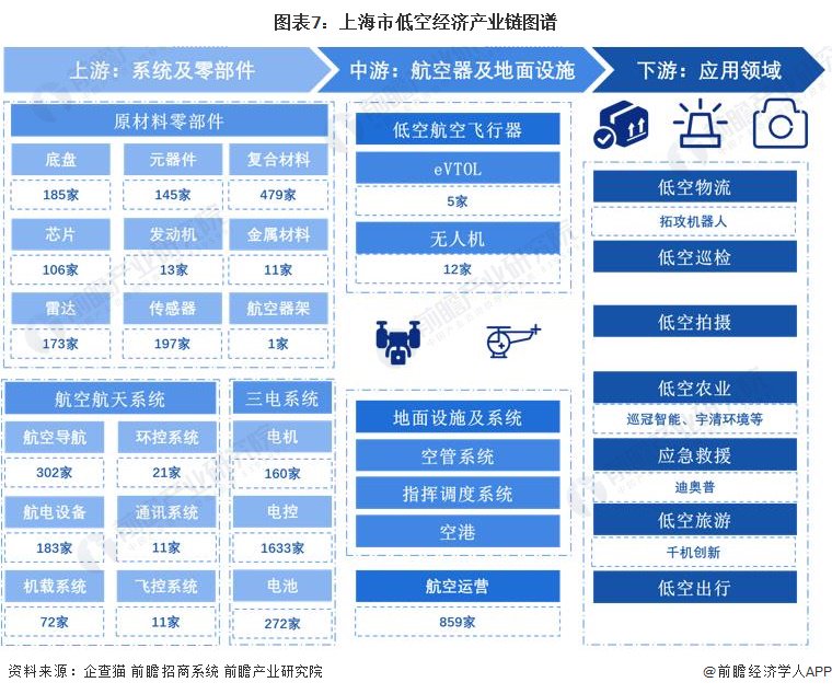 在政策指引和市場需求的驅動下,上海市低空經濟產業鏈不斷完善,其中,在低空航空飛行器的原材料、零部件、航空航天系統等上游企業有企業布局;在下游應用領域中布局低空物流和低空旅游等。在中游低空航空飛行器制造企業中,eVTOL企業約5家,無人機企業約12家。