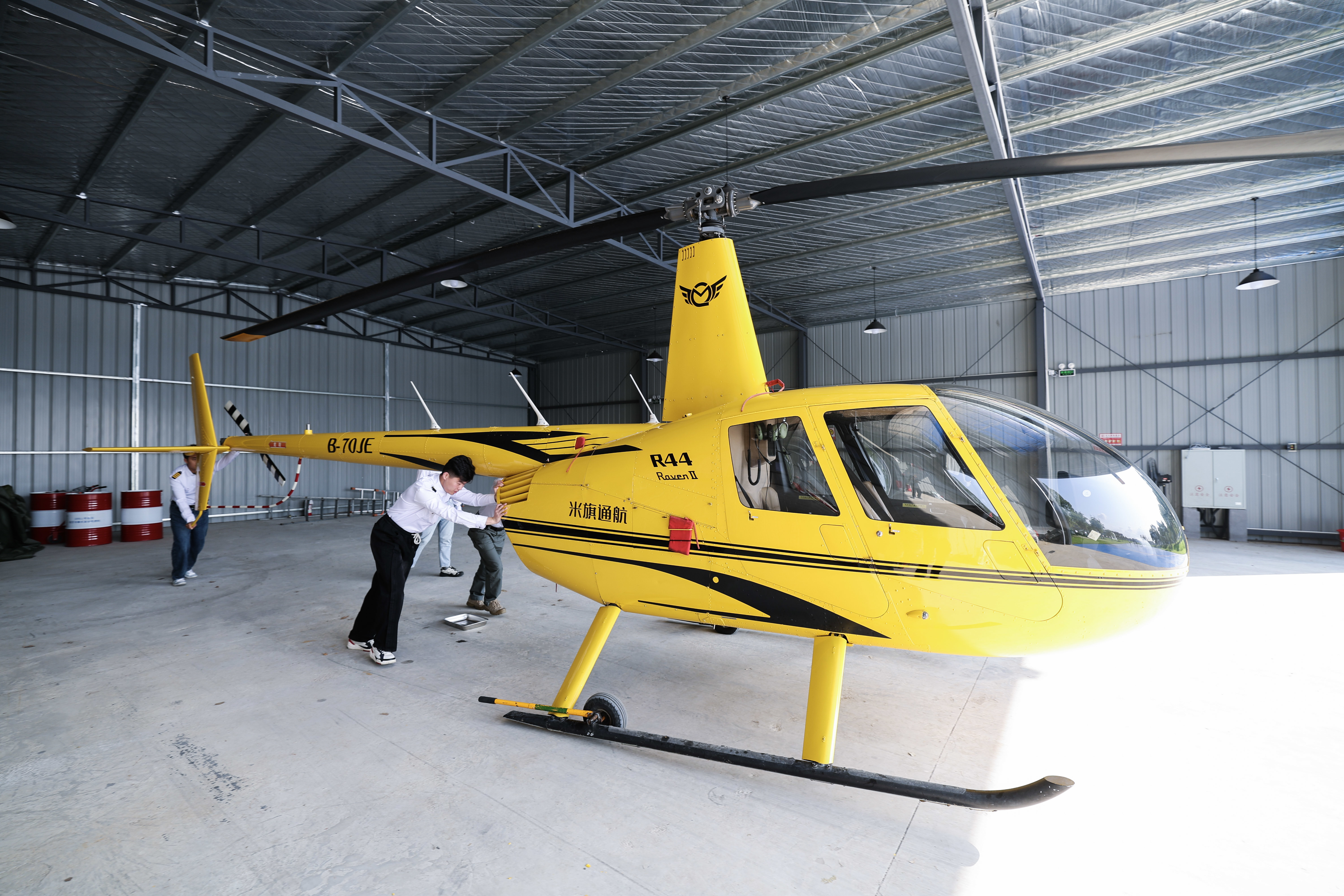 11月5日,在湖州米旗通航直升機(jī)飛行基地,飛行教員帶領(lǐng)學(xué)員把直升機(jī)推出機(jī)庫,準(zhǔn)備進(jìn)行日常培訓(xùn)。新華社記者 徐昱 攝