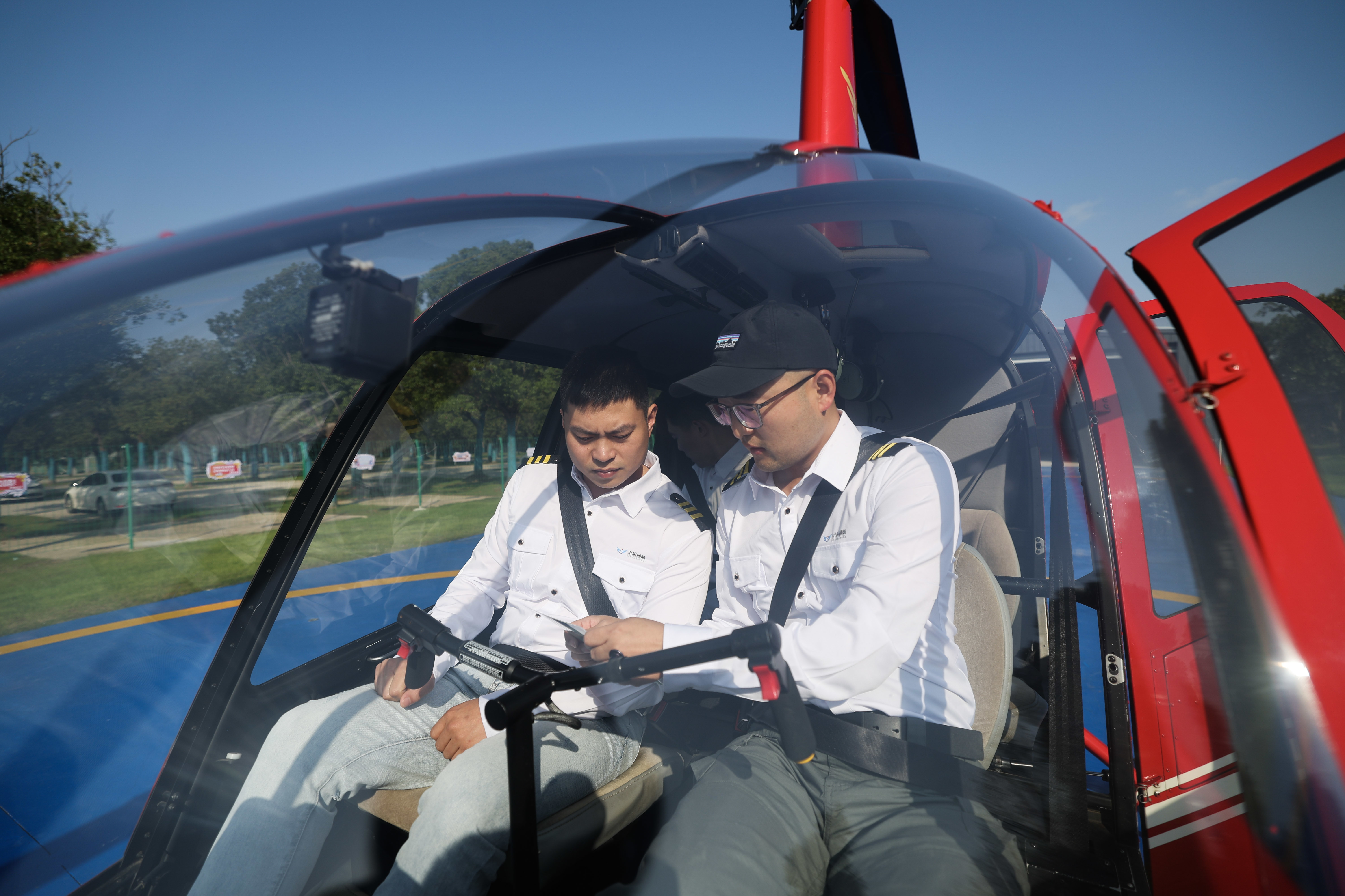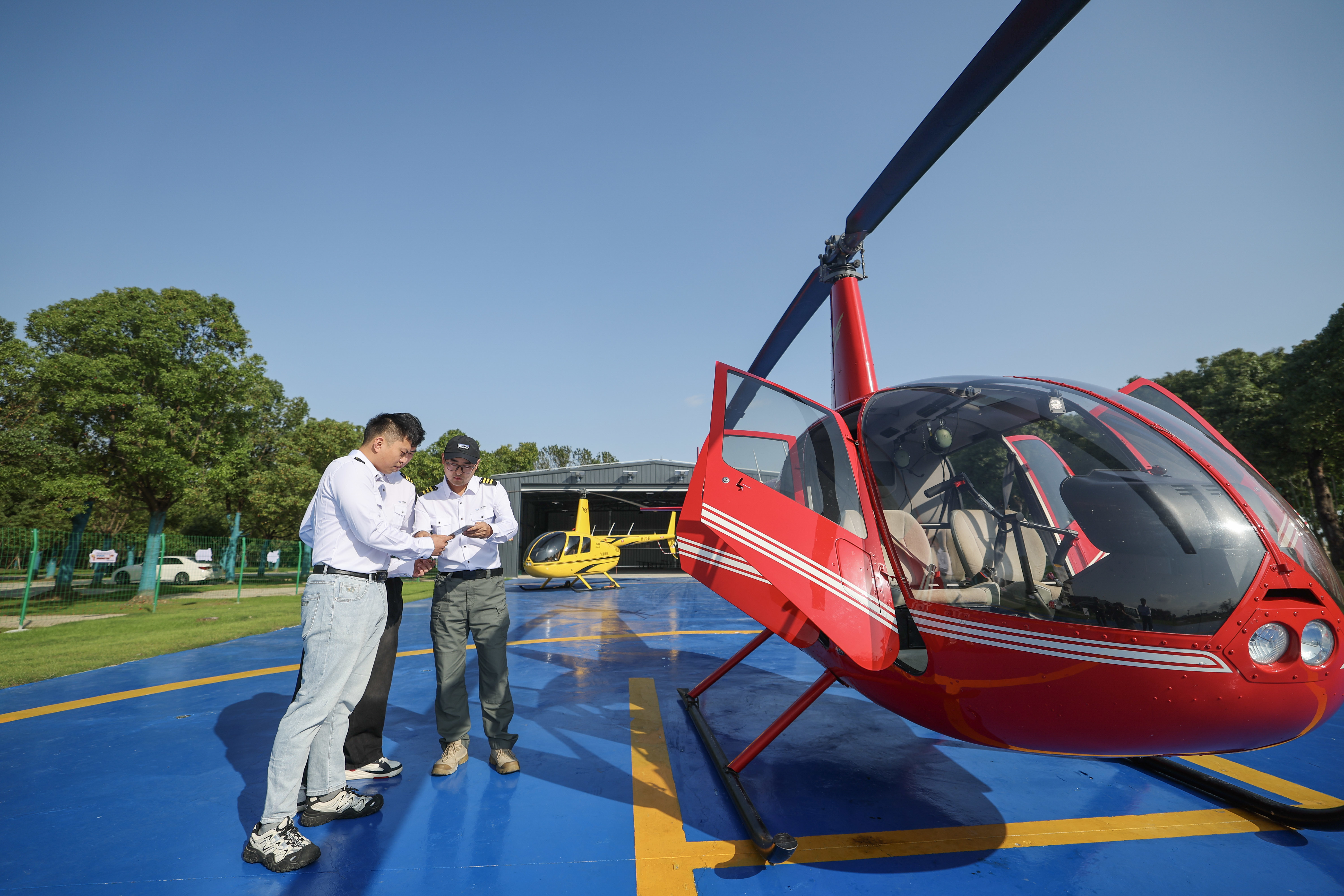 11月5日,在湖州米旗通航直升機(jī)飛行基地,飛行教員(右一)帶領(lǐng)學(xué)員進(jìn)行日常培訓(xùn)。新華社記者 徐昱 攝