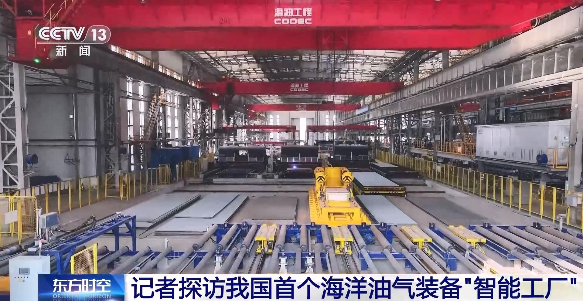 總臺央視記者 張偉:這里是我國首個海洋油氣裝備“智能工廠”的預制車間,一塊重達近10噸的鋼板,經過短短20分鐘,10余道工序,就加工成若干大小不一、形狀各異的平臺零件。零件將通過智能化的生產線,組裝成近萬噸的海洋裝備。