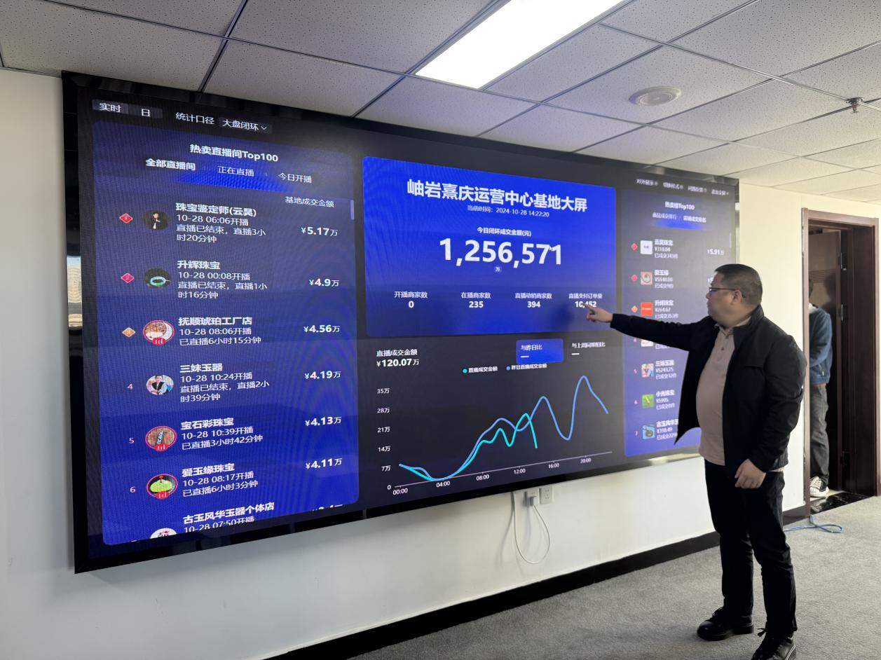 “1256571元,這是我們一上午的交易額”,岫巖熹慶運營中心的負責人指著墻上的大屏幕說:“通過這塊屏幕,不僅能實時看到各家商戶的開播、交易情況,還可以通過數(shù)據(jù)的波動及時發(fā)現(xiàn)存在的問題。”