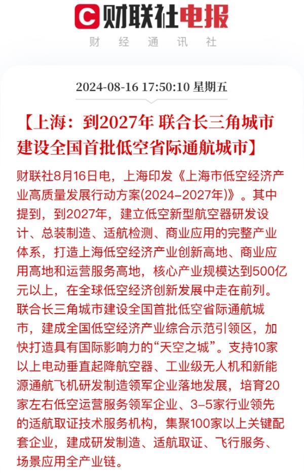 如上海明確,要建成全國(guó)低空經(jīng)濟(jì)產(chǎn)業(yè)綜合示范引領(lǐng)區(qū),加快打造具有國(guó)際影響力的“天空之城”。