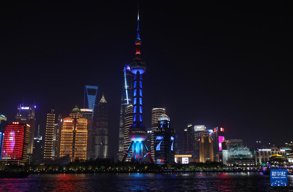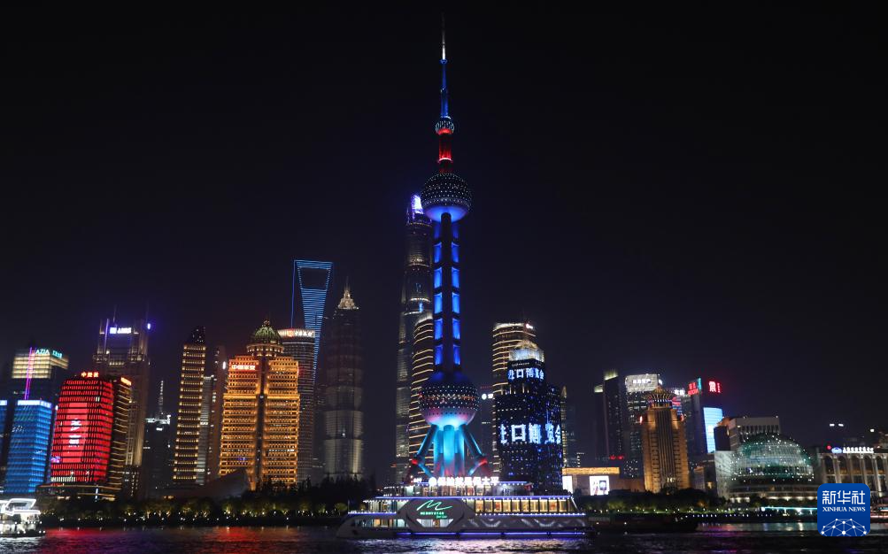 11月3日,位于上海陸家嘴的東方明珠廣播電視塔和大樓亮起主題燈光,迎接第七屆中國國際進口博覽會開幕。新華社記者 方喆 攝