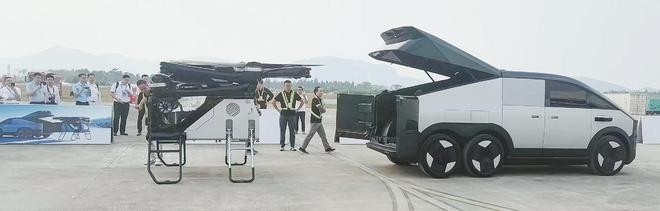飛行結束后,小鵬飛行汽車“陸地航母”的飛行體(左)與陸行體(右)準備結合。馬俊 攝