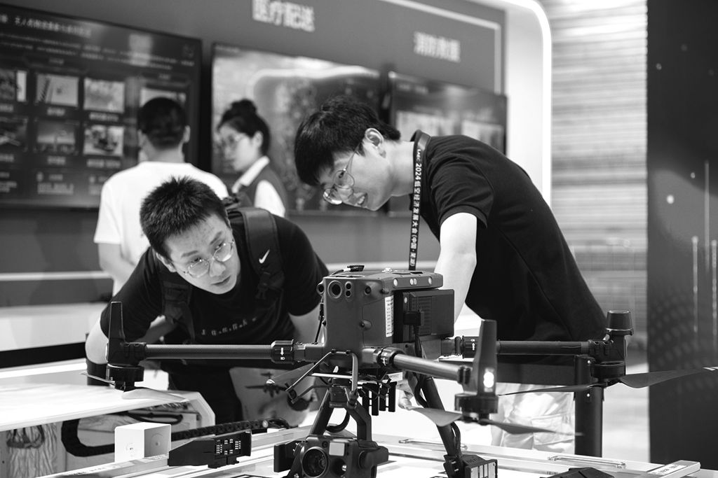 觀眾在大會創(chuàng)新成果展區(qū)了解一款用于巡檢的無人機(jī)。