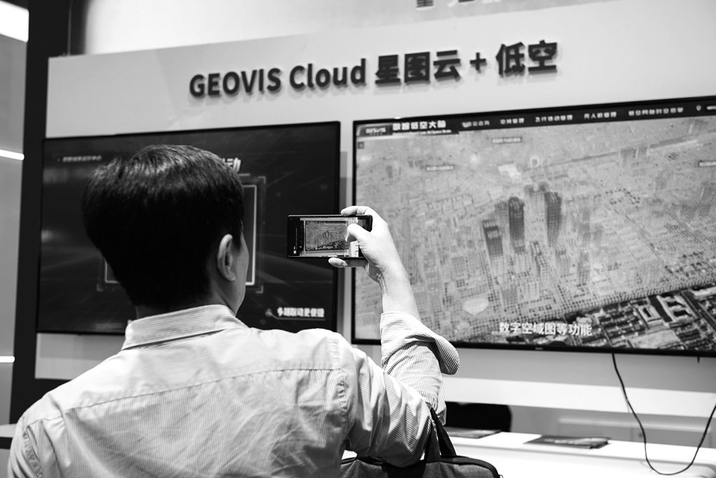 觀眾在大會創(chuàng)新成果展區(qū)了解可用于城市空域管理的數(shù)智低空大腦產(chǎn)品。