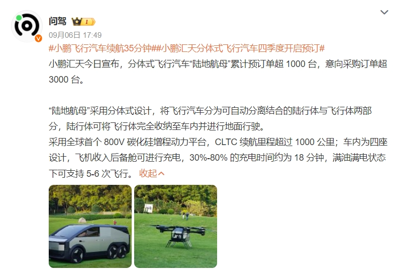 而且基于一體式飛行汽車的開發(fā)難度大,目前還有不少企業(yè)推出了分體式飛行汽車,兼顧陸行和飛行兩種行駛方式。其中,小鵬匯天的分體式飛行汽車“陸地航母”于9月3日對外正式亮相,計劃于今年11月珠海航展期間完成公開載人首飛,11月廣州車展期間首次公開亮相。9月6日,小鵬匯天宣布,分體式飛行汽車“陸地航母”累計預(yù)訂單超1000臺,意向采購訂單超3000臺。