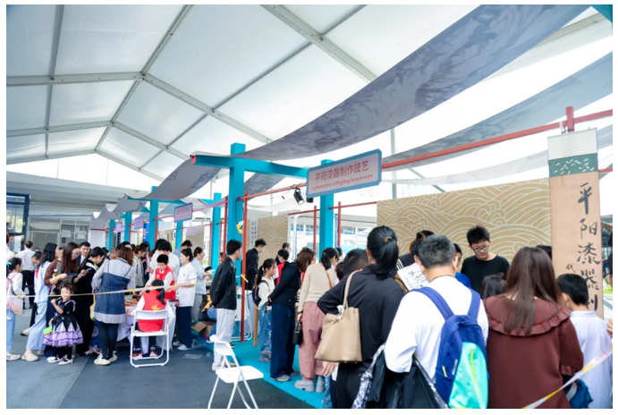 而在平陽漆器制作技藝展臺前,非遺老師將一把白色團扇浸入調好漆的水缸里,浸潤、翻轉,僅僅十秒鐘,扇面就成了寫意十足的國風畫,惹得在場人直呼神奇。
