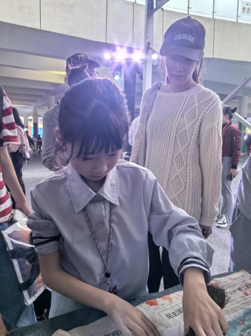 一位7歲的女孩李欣躍捋起袖子站到了木活字印刷術臺前,跟著非遺傳承人王老師的示范,玩起印刷。小孩姐認真的樣子,讓在場大人都連連稱贊,像個“小李子柒”。